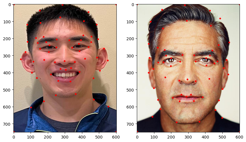To begin to morph my face into another person's face, we first must ensure the images line up with each other. This is done by defining corresponding points on both images and then proceeding to warp our images into the same "shape." We do this by manually choosing points corresponding to relevant features of our portrait, and then using these points to define a triangulation. We can then determine a transformation matrix to warp our triangles to our desired geometry.