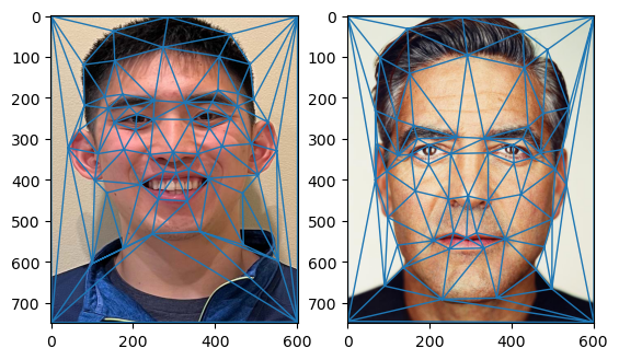 I did this on the average of the landmark points between the images I wanted to morph so that it would be the same triangulation for both images. Here are my points I plotted and the resulting triangulation: